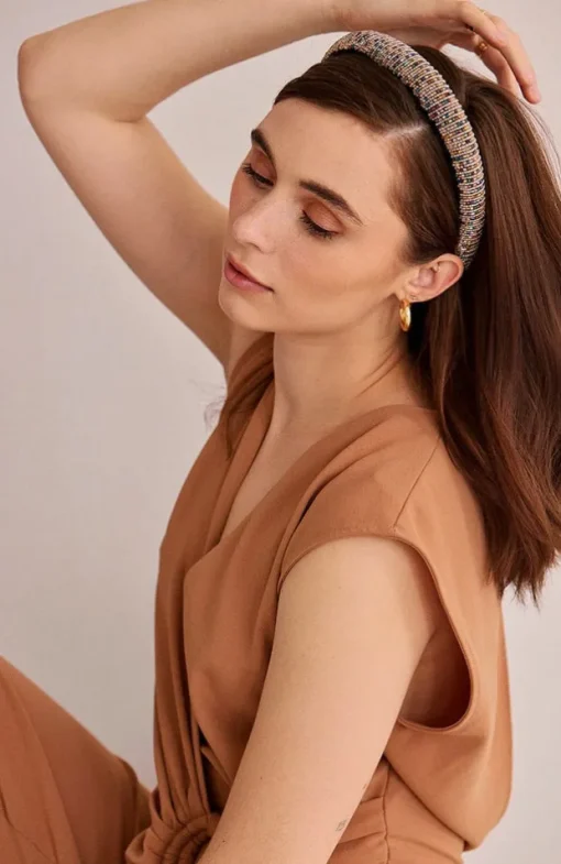 The Arya Headband by L. Erickson is a fashionable hair accessory that will elevate any outfit. This wide, beaded headband features a stunning array of multi-color irridescent and clear beads, adding a touch of sparkle and glamour to your look. This padded headband features stripes giving it a stylish and trendy appeal. Add a pop of sublte color and shimmer to your hairstyle with the Arya Headband.