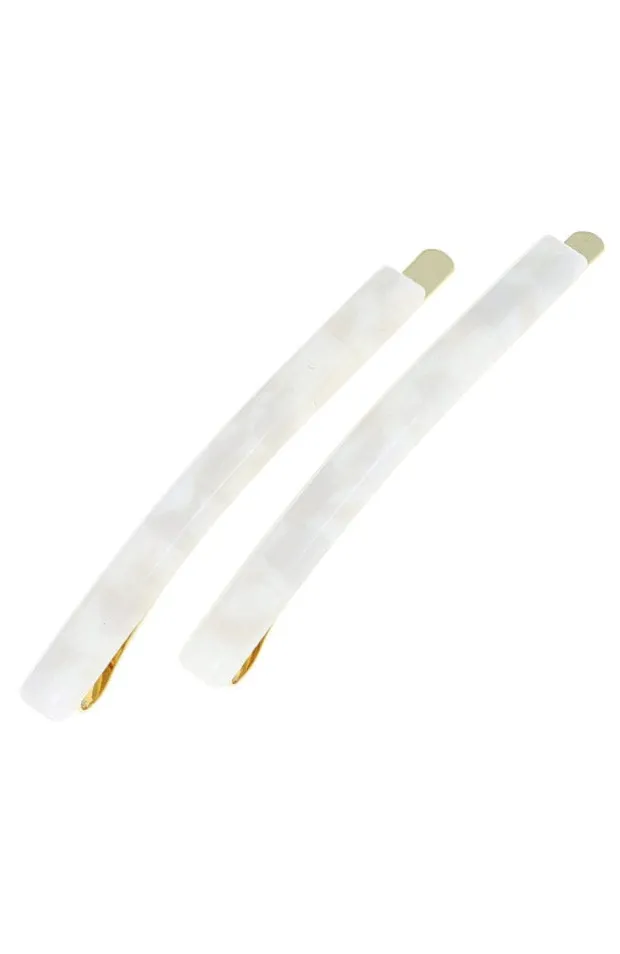 The France Luxe Bobby Pin Pair on Gold Wire – Coconut Milk is a versatile pair of decorative bobby pins to add to your daily ensemble. These hair pins are a quick and easy choice to sweep back your hair and enjoy a comfortable, all-day hold. Add a sophisticated look to your outfit elevating your look with these lovely bobby pins. Handmade in France and polished to a lustrous sheen. These bobby pins feature beautiful white acetate on a gold tone bobby pin.