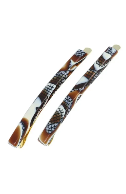 The Bobby Pin Pair Fudge on Gold Wire by France Luxe are perfect for an easy, yet polished hairdo. With a touch of elegance, these fudge-colored hair accessories will add a sophisticated flair to any hairstyle. Made in France and measuring just over 2 1/2″, these bobby pins are the perfect size to keep your hair effortlessly in place.