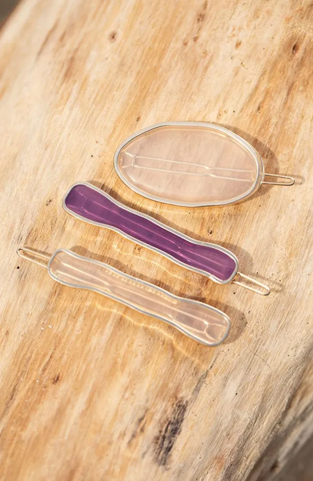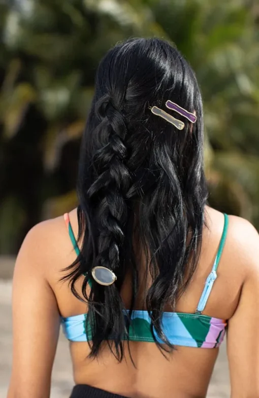 The L. Erickson Laguna Tige Boule Hair Clip Set is a cute, beachy hair accessory set. These hair clips resemble sea glass with gold tone metal on a tige boule style barrette clasp. This hair accessory is ideal for most hair types. Add bohemian vibes to your outfit with this easy to use hair accessory.