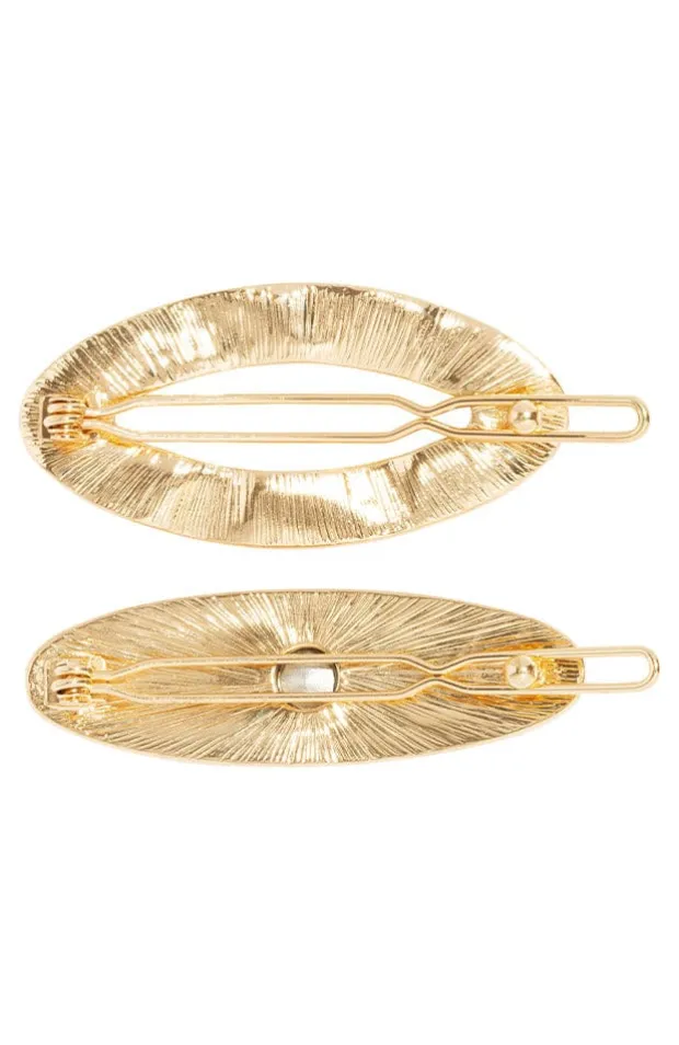 The L. Erickson Solana Tige Boule Set is a cute pair of hair clips. These metal hair clips feature a delicate tige boule clasp, ideal for thin or thick hair. One hair clip features a crystal embelishment, and the other is a cutout barrette. Add elegance to your outfit with this easy hair style accessories. Wear them together or separately.